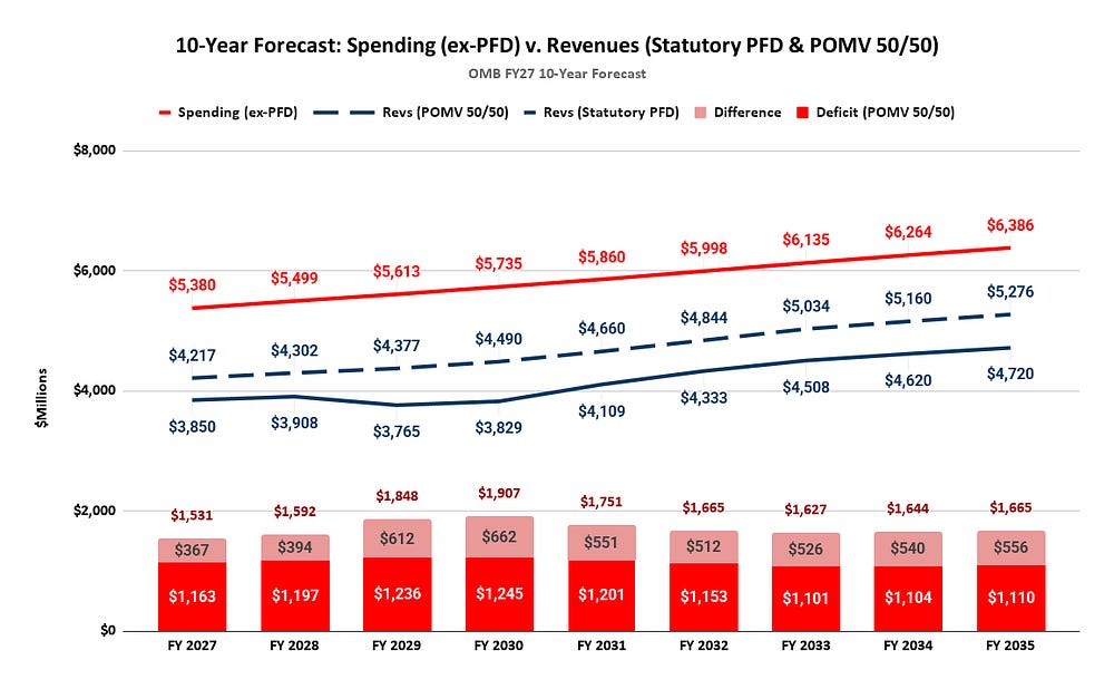 Some attribute the deficits to the projected distribution of Permanent Fund Dividends (PFDs) at statutory levels over the period. But that is seriously misleading.