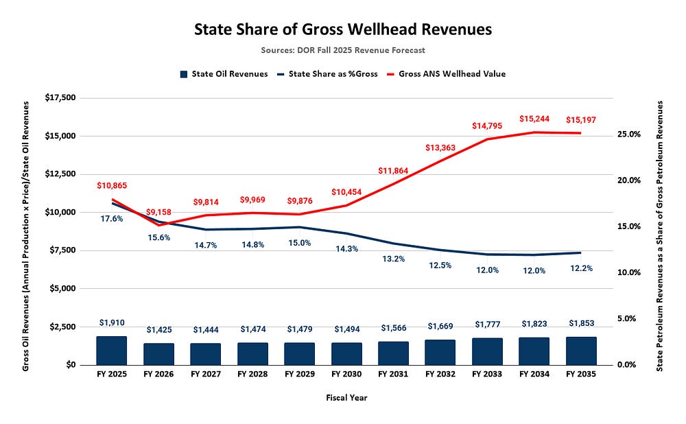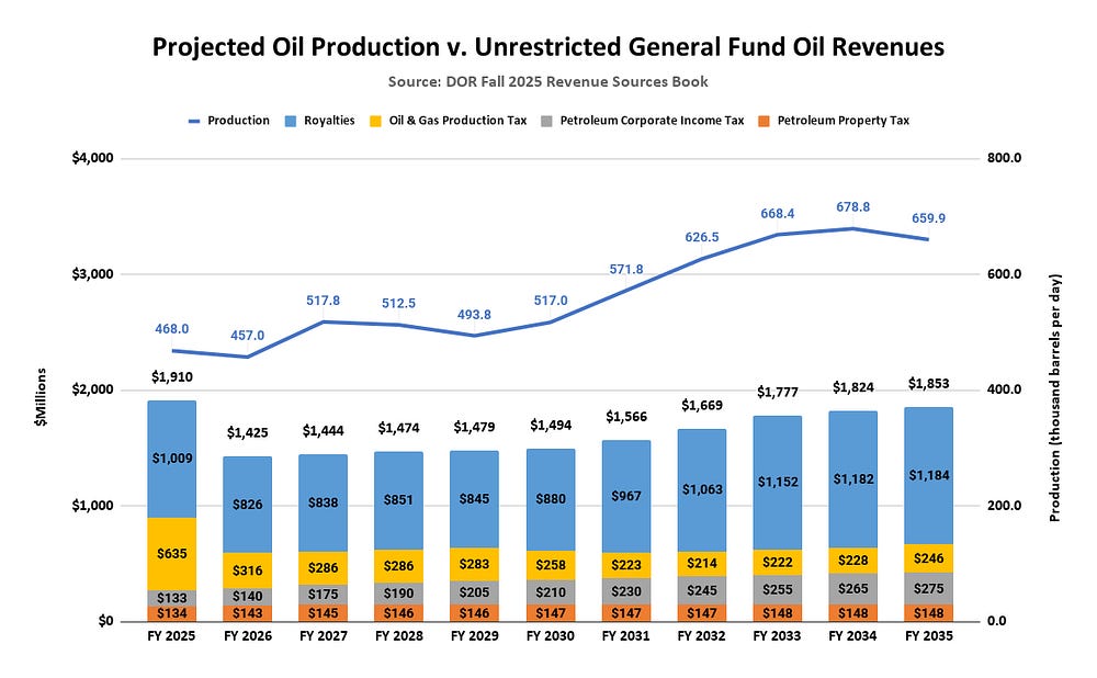 While over the period, production volumes rise by 41%, from 468 thousand barrels per day (kbd) in Fiscal Year 2025 (FY2025) to 660 kbd in FY2035, unrestricted general fund (UGF) revenues from oil drop by 3%, from $1.9 billion in FY2025 to $1.8 billion in FY 2035.