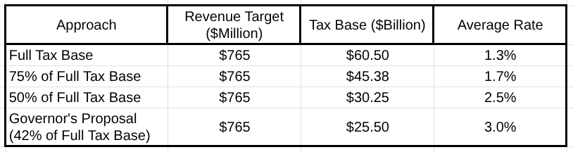 Using the state’s full potential tax base as a starting point, here are some options for raising the same amount of revenue as reported for the Governor’s anticipated sales tax, using different bases. The tax rates are averages; they could be structured seasonally, as in the Governor’s approach.