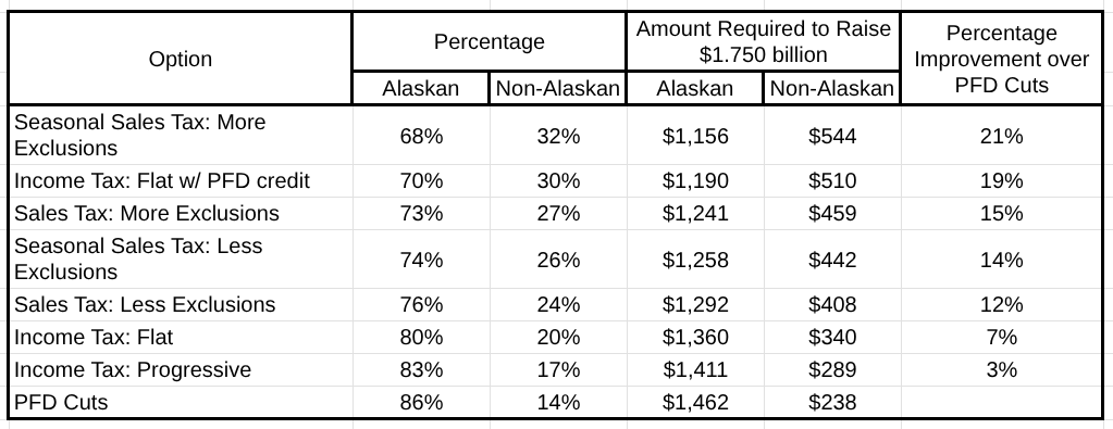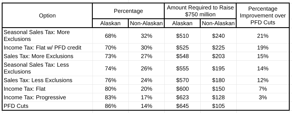 Using the $750 million mark - roughly the level proposed to be raised annually by Governor Mike Dunleavy’s (R-Alaska) seasonal sales tax - here is the breakdown between Alaskans and non-Alaskans among the various options, ranked from the lowest, in terms of overall burden on Alaskans, to the highest: