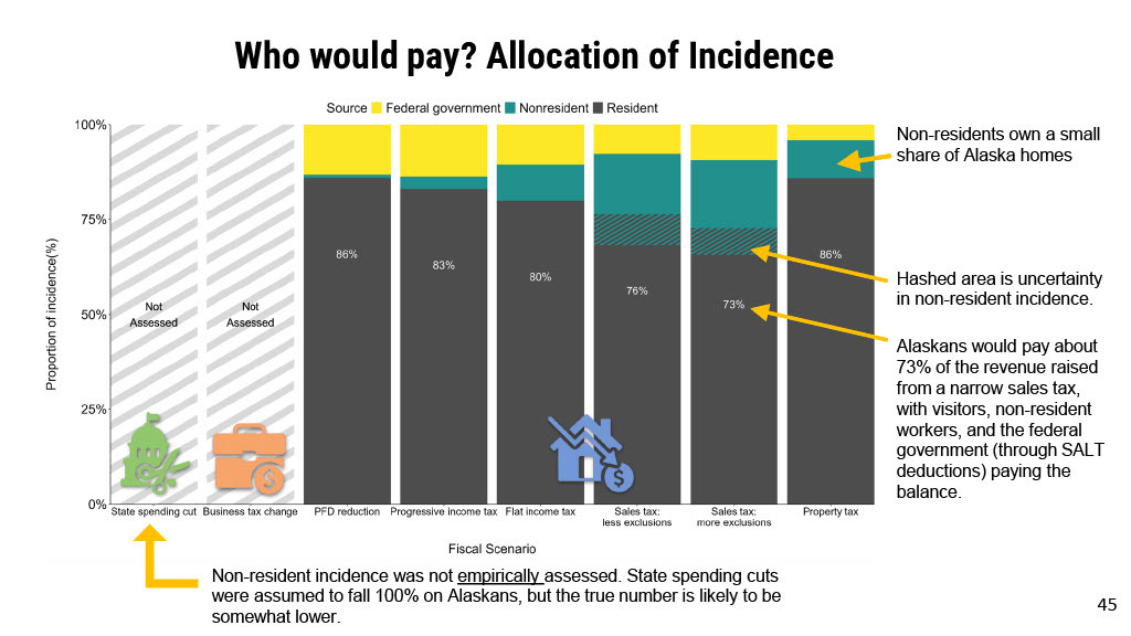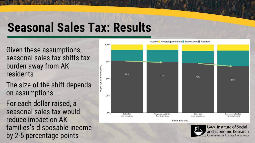 For example, if all of the options push roughly 15% - 20% of the burden to non-Alaskans, that really doesn’t significantly change the calculus of the extent to which one option takes more from middle and lower-income Alaska families or has a larger impact on the overall Alaska economy than another. The regressivity characteristics of the options still dominate the outcome.