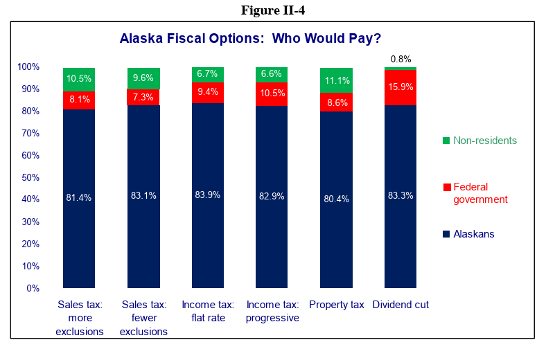 Taken together, the alternatives offer a wide range in the share of any fiscal option borne by non-Alaskans, ranging from 14% (PFD cuts) at the low end to 30% (flat income tax with credits) and 32% (seasonal sales tax with more exclusions) at the high end.