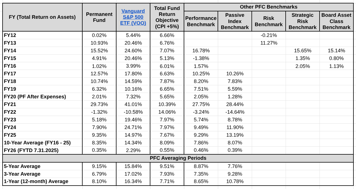Our most recent analysis of the PFC’s performance, based on its “Monthly Performance Report” as of July 31, 2025, confirms this result. As the following chart shows, in every year except one since FY 12, returns using the Buffett-recommended Vanguard S&P 500 index fund (third column, “Vanguard S&P 500 ETF (VOO)) have exceeded those achieved by the PFC.