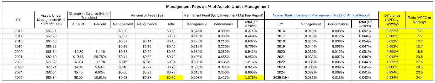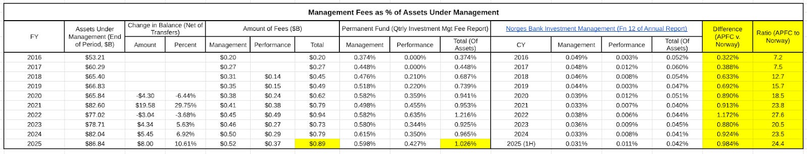 Moreover, the amounts spent on fees on that regressive effort have been significant. Over the three years from FY 23 through FY 25, the PFC spent approximately $2.4 billion on fees, an amount equal to roughly 3% of the total fund balance as of the end of FY 25. On average, that equals approximately $800 million annually over the period, or nearly 1% of assets under management.