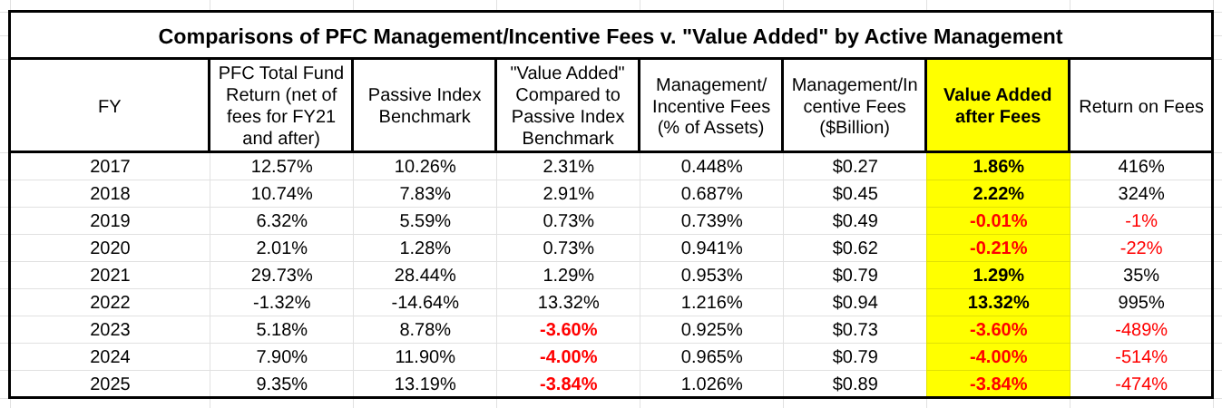 The PFC spends A LOT on its "active management" investment approach. Comparing the results to two passive benchmarks, including the PFC's own, makes clear the approach isn't worth the money spent