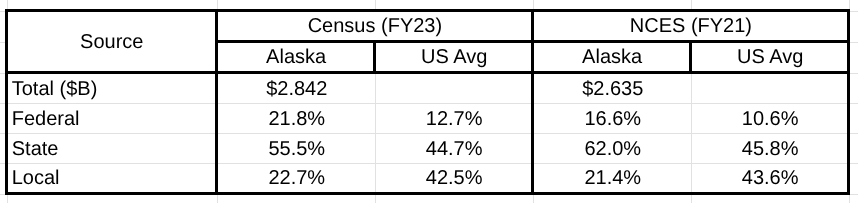 Alaska is significantly out of step with those averages. Using the Census Bureau data, in Alaska, the Federal government provides 21.8% of total K-12 funding, the state provides 55.5% and local sources provide 22.7%. Focusing on the state/local split, the state provides 71% of the combined state and local funding, with local sources supplying only 29%.
