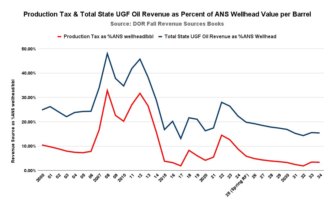 The second is that, despite being governed by the same general approach, the production taxes projected to be realized as a share of gross oil revenues during the second SB21 period (FY2026-34) are significantly lower than those during the first, and lower even still than those during the pre-ACES period. While some have claimed that the lower levels realized under SB21 compared to the pre-ACES period would turn around over time, the projections demonstrate that the levels actually continue to fall further instead.
