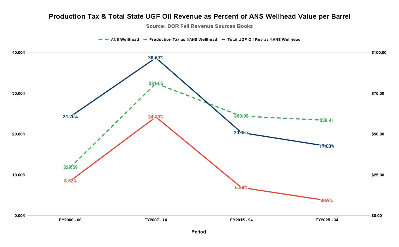 Here are the averages over the four periods. As in the previous chart, we include the share of gross oil revenues raised through production taxes in red and, for perspective, the share of gross oil revenues received by the state as unrestricted general funds from all petroleum sources in blue. To provide additional perspective, we also include the “ANS Wellhead Weighted Average [Value] All Destinations” averaged for the period.