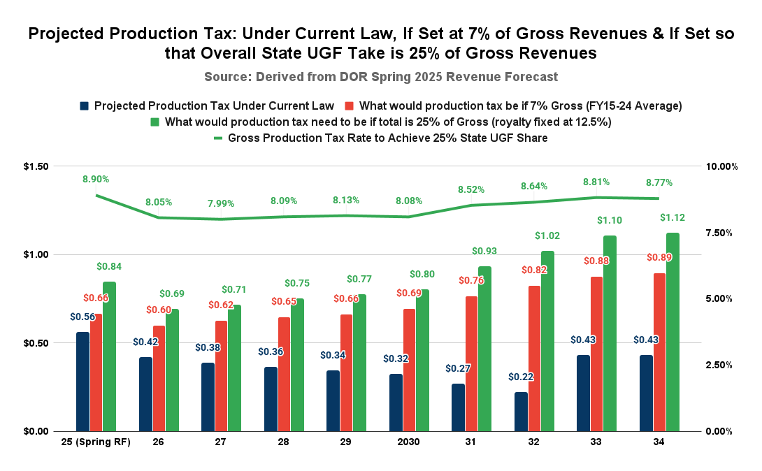 The result of substituting that approach for SB21 is that, instead of declining over the period as projected under SB21, projected production tax revenues rise by nearly 35%, equalling the rate of increase in overall gross revenues, from $660 million (FY2025) to $890 million. Instead of averaging only $370 million per year over the period as is projected under SB21, production tax revenues would average approximately $720 million per year.
